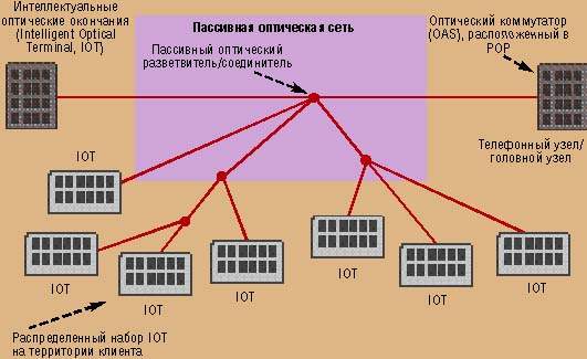 Рисунок 1. В типичной топологии доступа на базе пассивной оптической сети (Passive Optical Network, PON) провайдер прокладывает единственный оптический кабель, идущий от его телефонного узла (CO) или точки присутствия (POP) к группе конечных пользователей. Разветвитель направляет трафик каждого клиента в его помещение.