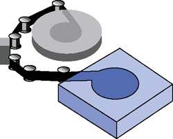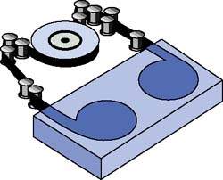 При загрузке ленты специальный механизм захватывает ее свободный конец, протягивает его по направляющим стойкам и аккуратно наматывает ленту на приемную катушку. Направляющие стойки размещены таким образом, чтобы натяжение ленты было минимальным. Магнитный слой ленты не соприкасается с направляющими стойками на всем протяжении до приемной катушки, что значительно повышает ее износоустойчивость (см. Рисунок 2).