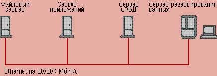 По сути, на рисунке представлена трехуровневая локальная сеть телекоммуникационного предприятия, где нижнему уровню соответствуют файловые серверы и клиентские рабочие станции; среднему уровню — серверы приложений, таких, как электронная почта, печать, связь с контроллером коммутатора и т. п.; верхнему уровню — сервер СУБД, отвечающий за работу биллинговой системы.