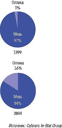 Когда бы это ни произошло, рассматриваемый процесс будет медленным и постепенным. Компании не сразу начнут отказываться от своей инфраструктуры медных кабелей в пользу волоконно-оптических соединений или чего-то еще. Однако когда организации исчерпают все ресурсы имеющихся кабелей Категории 5 (т. е. подведут Gigabit Ethernet к каждой настольной системе), они начнут переходить на оптическое волокно. Эта постепенная замена приведет к тому, что оптическими к 2004 г. станут 16% всех портов в локальных сетях (включая порты коммутаторов, концентраторов и сетевых адаптеров), что существенно больше 3% в 1999 г. (см. Рисунок 3).