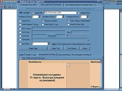 WebStress может работать через proxy-сервер и поддерживать аутентификацию (если требуется) и различные способы взаимодействия с посредником. В целом WebStress ведет себя как типичный браузер, благодаря чему тест оказывается абсолютно аутентичным. При необходимости можно задействовать даже поддержку «плюшек». Более того, саму утилиту можно использовать в качестве браузера. Это, разумеется, нужно не для того, чтобы отказаться от привычных Explorer или Navigator, а в целях контроля за результатами тестов. Например, проводя тест с измерением времени загрузки, помимо секундомера и статистики хода процесса мы можем одновременно наблюдать процесс загрузки «вживую». Возможность посмотреть, как это происходит во время массового теста, т. е. при сильно нагруженном сервере, очень полезна. Например, она позволяет обнаружить такой характерный симптом перегрузки, как неполное отображение графики.
