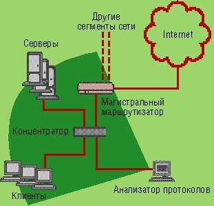 | Рисунок 1. В традиционной локальной сети с разделяемой средой передачи анализатор протоколов или монитор может исследовать весь трафик данного сегмента сети. |
