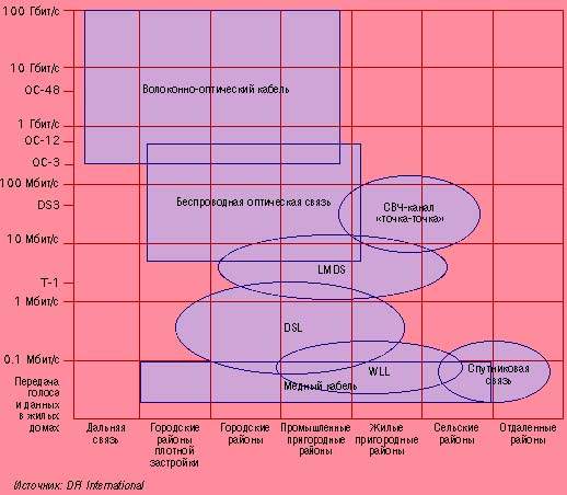 | Рисунок 1. Беспроводная оптика сегодня применяется исключительно на территориях городов, поскольку беспроводные оптические сети необходимо развертывать в непосредственной близости от крупных концентраторов. Отдаленные и сельские районы пока остаются на периферии зоны охвата. |