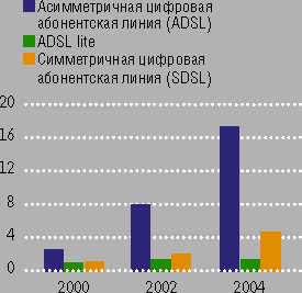 | Рисунок 1. К 2004 г. в мире будет насчитываться свыше 4 млн абонентов SDSL. |