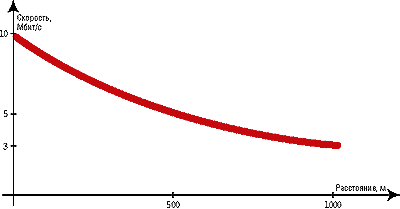 | Рисунок 7. Зависимость скорости передачи данных от расстояния при работе HPNA по проводу ТРП. |