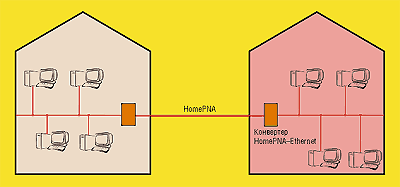 | Рисунок 6. Использование HPNA для объединения сегментов локальных сетей. |