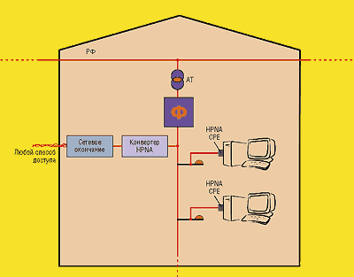 Еще одно преимущество Home-PNA — возможность реализации компромиссной комбинированной топологии среды передачи. Большинство клиентов, обычно не нуждающихся в высоких скоростях доступа, подключаются к общей «шине». Подключить же тех клиентов, кому требуется гарантированная высокая пропускная способность, можно с помощью отдельных линий до коммутатора Home-PNA. По мере появления новых заказчиков число портов на коммутаторе можно будет увеличивать.
