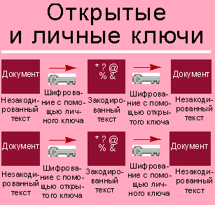 К примеру, вы хотите послать по электронной почте личное письмо своему доверенному лицу. Сообщение шифруется с помощью предоставленного этим человеком открытого ключа, который, как правило, хранится в каталоге, чтобы им мог воспользоваться любой желающий, но расшифровать послание можно только с помощью личного ключа (который ваш корреспондент должен иметь). Даже если это сообщение перехватит посторонний, он не сможет прочесть его, воспользовавшись открытым ключом вашего приятеля.