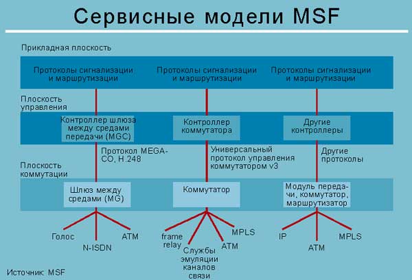 Этот рисунок иллюстрирует сети ATM и VoP на базе MSF. В сети VoP/VoIP контроллер шлюза связан по протоколу MEGACO (H.248) или Media Gateway Control Protocol (MGCP) со шлюзом голос/мультимедиа. Контроллер шлюза и шлюз позволяют выполнять перевод между обычными телефонными звонками и вызовами IP, осуществляемыми по протоколу инициирования сеансов (SIP). В сети ATM универсальный протокол управления коммутатором (GSMP) поддерживает соединения с коммутатором ATM, позволяя создавать «нейтральные к производителю» виртуальные соединения ATM.