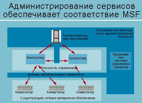 | Эта система управления сервисом функционирует как уровень трансляции и как определенный вид «прикладной плоскости», к которой относятся задачи координации сервиса. Программное обеспечение для административного управления предоставляет уровень трансляции между несовместимыми сетевыми элементами для создания подобия структуры MSF. На этом примере можно видеть, как архитектура MSF могла бы использоваться в существующих сетях. |