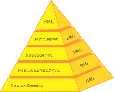 С точки зрения организации сеть TMN представляется в виде пирамиды (см. Рисунок 1) с пятью иерархическими уровнями: сетевые элементы (Network Element Layer, NEL), управление элементами (Element Management Layer, EML), управление сетью (Network Management Layer, NML), управление сетевыми сервисами (Service Management Layer, SML) и управление бизнес-процессами (Business Management Layer, BML).