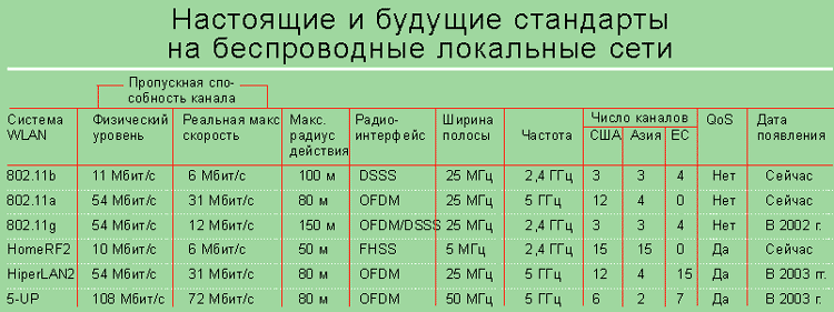 Помимо хорошо известного IEEE 802.11b широкое распространение могут получить еще пять стандартов на беспроводные локальные сети. В перспективе успех может ожидать тех, которые рассчитаны на диапазон 5 ГГц.