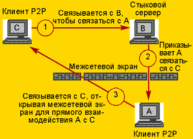 | Рисунок 2. Стыковой сервер (B) получает запрос от клиента P2P с внешней стороны межсетевого экрана (C) на установку соединения с клиентом P2P за межсетевым экраном (A). A инициирует взаимодействие, открывающее межсетевой экран для прямого трафика от C. |