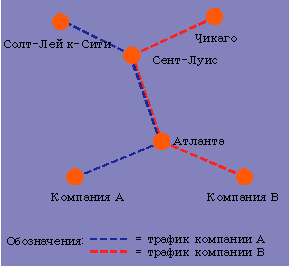 | На той же длине волны. Коммутатор с прогнозированием в Атланте помогает сократить расходы на оборудование, поскольку трафик из Чикаго и Солт-Лейк-Сити может использовать одну и ту же длину волны на пути к Атланте. |