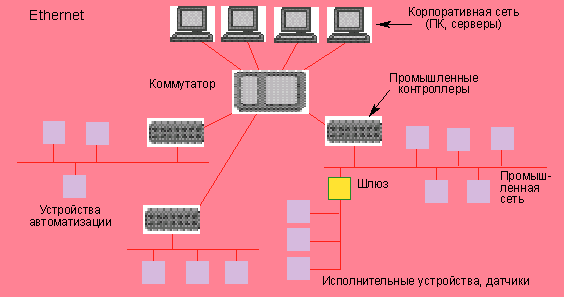 Трехуровневая сеть, объединяющая офисную сеть Ethernet и устройства автоматизации.