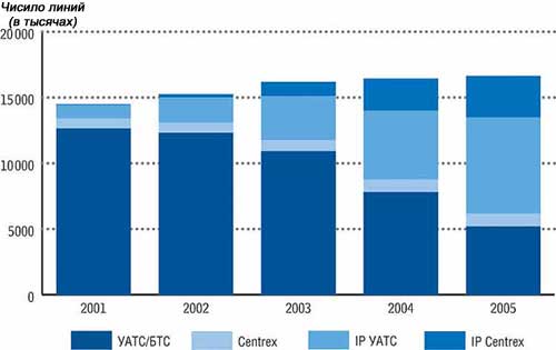 | Будущее конвергенции. Пользователи вряд ли захотят сразу отказаться от уже имеющихся у них УАТС/БТС (базовых телефонных систем, Key Telephone Systems), но объем продаж новых каналов IP в следующие три года будет расти очень быстро. |