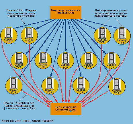 В распределенных отраженных атаках по типу «отказ в обслуживании», представленных на данном рисунке, множество серверов TCP посылает пакеты SYN/ACK, чтобы вызвать перегрузку на сайте в надежде, что он захочет открыть соединением TCP с их серверами. По существу, хакер использует генератор пакетов SYN, чтобы «затопить» маршрутизаторы Internet посылаемыми в рамках запроса на соединение TCP пакетами SYN, при этом пакеты содержат фальшивые IP-адреса источника, в качестве которого указывается атакуемый сайт. Все это, конечно, приводит к блокированию сайта.