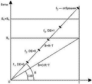 На Рисунке 3 изображен пример, когда за интервал времени t в сеть по виртуальному каналу поступило пять кадров. Средняя скорость поступления информации в сеть составила на этом интервале R бит/с, и она оказалась выше CIR. Кадры f1, f2 и f3 доставили в сеть данные, суммарный объем которых не превысил порог Bc, поэтому эти кадры ушли дальше транзитом с признаком DE=0. Данные кадра f4, прибавленные к данным кадров f1, f2 и f3, уже превысили порог Bc, но еще не превысили порога Bc+Be, поэтому кадр f4 также отправлен дальше, но уже с признаком DE=1. Данные кадра f5, прибавленные к данным предыдущих кадров, превысили порог Bc+Be, поэтому этот кадр был удален из сети.