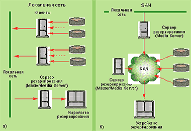 | Рисунок 1. Сравнение резервного копирования по а) локальной сети и б) сети SAN. |