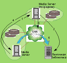Как уже отмечалось ранее, множественный доступ к ленточной библиотеке со стороны медиасерверов в среде SAN опасен возможными конфликтами. В этом случае политика резервного копирования должна предусмотреть выделенный узел (очевидно, один из медиасерверов), на который будет возложена роль главного арбитра, или посредника соединений (Connection Broker), и ответственность за предоставление равного доступа к ленточной библиотеке остальным медиа-серверам.