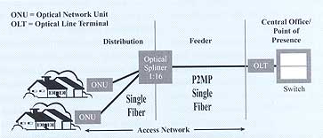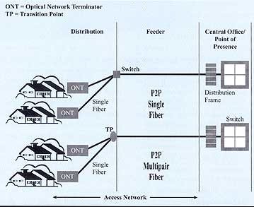 На Рисунке 2 показана топология сети «точка — точка» на базе оптического волокна. Когда соединения Ethernet прокладываются до дома, абонент подключается к коммутатору доступа или агрегирующему коммутатору, установленному на цоколе поблизости от дома во всепогодном корпусе; для доступа к службе спасения 911 можно установить батареи резервного питания, также с защитными корпусами. Переход с оптического канала в домашнюю сеть на медном кабеле или ином носителе осуществляется на терминале оптической сети (ONT).
