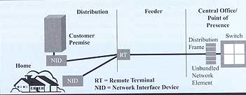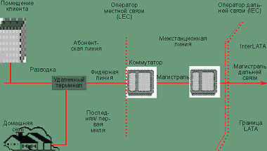 На Рисунке 1 приводится примерная схема сегментирования современной телефонной сети относительно последней мили. Оператор местной связи (Local Area Exchange, LEC) обслуживает область локального доступа и передачи (Local Access and Transport Area, LATA), куда входят отрезок последней мили (абонентская линия) и межстанционные каналы связи.