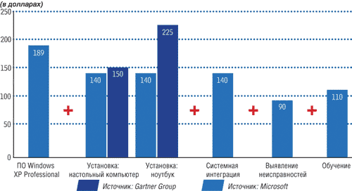 | Подсчет стоимости. Расходы на обновление ОС включают пять составляющих. Продукты для массового перехода на другую ОС могут уменьшить либо свести к нулю три средние колонки. Все цифры приводятся из расчета установки на одну машину и не подразумевают подключение нового оборудования. |
