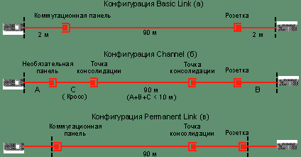 | Конфигурация Basic Link (a) включает кабель измерительного оборудования длиной до 2 м, который в новую конфигурацию Permanent Link (б) не входит. В конфигурацию Channel (в) введены коммутационные панели и соединительные шнуры, обычно применяемые в реальных системах. |