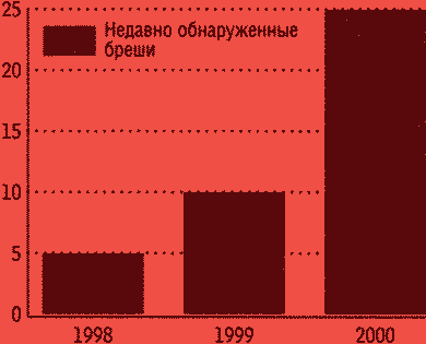| Количество брешей, обнаруженных за неделю. По информации SecurityFocus.com, количество уязвимых мест в системе безопасности, выявляемых еженедельно, увеличилось более чем в два раза за период с 1999 г. по 2000 г. Хакеры могут использовать эти недоделки, чтобы проникнуть в компьютерные сети и вывести их из строя. |