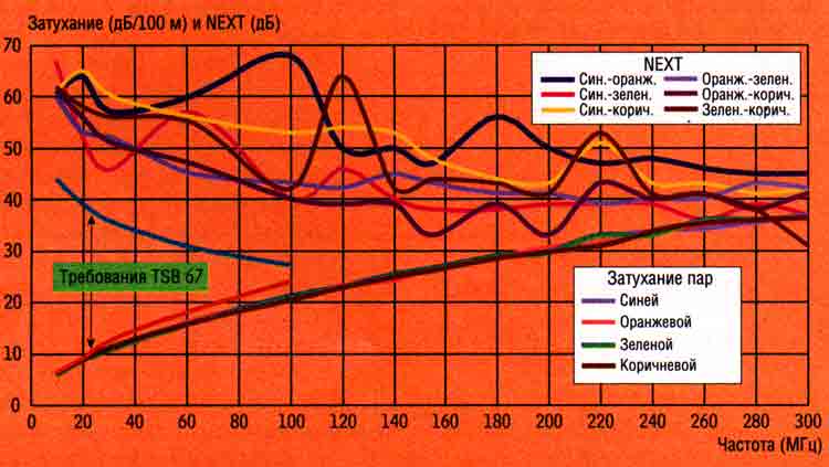 Затухание и переходное затухание (NEXT) экспериментальной линии горизонтальной проводки (Channel) Категории 5+ (результаты 1996 г.).