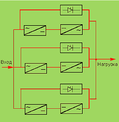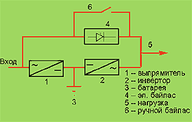 | Рисунок 1. Схема источника бесперебойного питания с двойным преобразователем. |