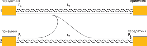 Определение параметров влияния для двух пар. NEXT = 10 lg (P0/P1); FEXT = 10 lg (P0/P2); ACR = NEXT - AC ELFEXT = FEXT - AC, где P0 — мощность сигнала на ближнем конце пары 1 (влияющей); P1 — мощность помехи, перешедшей на ближний конец пары 2; P2 — мощность помехи, перешедшей на дальний конец пары 2; AC — собственное затухание пары (дБ). |