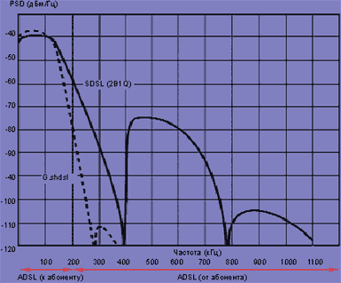 С помощью ТС-РАМ дальность связи по сравнению с системами SDSL на базе линейного кода 2B1Q увеличилась на 15—30%, а по сравнению с системами, основанными на коде CAP, — на 10%. Снижение мощности сигнала, сужение его спектра и смещение в сторону низких частот (см. Рисунок 4), ставшие возможными благодаря кодированию ТC-PAM, позволяют избежать интерференции со смежными частотами. Как видно из рисунка, благодаря форме спектральной плотности сигнала G.shdsl (Power Spectral Density, PSD), т. е. распределению энергии сигнала по полосе частот, он слабо влияет на нисходящий поток ADSL (в отличие, например, от SDSL и HDSL с кодированием 2B1Q). При подключении оборудования G.shdsl к тому же кабелю, что и ADSL, наводки будут меньше: на нисходящий поток (к абоненту) они практически не влияют, а для восходящего (от абонента) — незначительны. Тем самым достигается лучшая совместимость с трафиком ADSL, а операторы могут развертывать сервис G.shdsl, не отказываясь от уже предоставляемых абонентам услуг xDSL.
