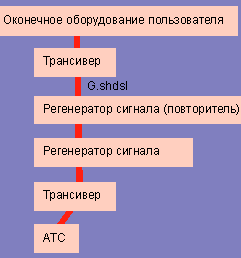 Новый стандарт, ставший дальнейшим развитием HDSL2, получил название G.shdsl (G. Symmetric High Bit-Rate Digital Subscriber Line), или G.991.2, и был принят Международным союзом электросвязи (ITU) в феврале 2001 г. Он изначально был ориентирован на системы для мультисервисных сетей с поддержкой передачи разнородного трафика и различных протоколов. G.shdsl обеспечивает скорость передачи данных по одной медной паре до 2,3 Мбит/с и, по сравнению с другими технологиями xDSL, дает увеличение скорости на 35—45% или увеличение дальности относительно HDSL при той же скорости на 15—20%. Обмен данными в обоих направлениях выполняется с одной скоростью. Для усиления сигнала и увеличения дальности связи могут использоваться повторители (см. Рисунок 3), в результате дальность действия системы возрастает в три раза. Работа возможна как по одной, так и по двум медным парам. При наличии у оператора свободных медных пар в кабеле можно повысить скорость обмена в системе G.shdsl за счет подключения двух дополнительных медных пар (четырехпроводной линии) до 4,624 Мбит/с или примерно на 25% увеличить дальность с сохранением пропускной способности.
