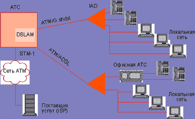 ADSL (Asymmetric DSL). Технология асимметричного цифрового соединения позволяет организовать передачу голоса и данных на расстояние около 5,5 км от АТС со скоростью до 8 Мбит/с в направлении к абоненту и до 1-1,5 Мбит/с — от него и превратить существующие абонентские телефонные аналоговые линии UTP Категории 3 в линии высокоскоростного доступа. В ADSL применяются два типа линейного кодирования — САР и DMT. Телефонный и цифровой сигналы при передаче по линии не мешают друг другу, так как занимают различные частотные спектры, поэтому одну пару проводов можно одновременно использовать для передачи данных и подключения к городской АТС обычного телефонного аппарата. ADSL рассматривается как технология потребительского класса и является одной из наиболее развитых технологий асимметричной передачи в семействе xDSL. Оборудование ADSL можно автоматически или принудительно конфигурировать для достижения максимальной скорости передачи с минимальным коэффициентом ошибок.