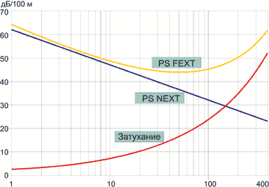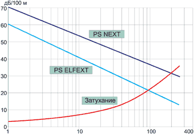 Оценочные графики частотных зависимостей некоторых параметров кабеля, рассмотренных выше, даны на Рисунке 3. Проанализируем эти характеристики. Затухание, как следует из теории, растет почти пропорционально корню квадратному из частоты. Суммарное переходное затухание на ближнем конце (PS NEXT) между парами кабеля представляет собой в полулогарифмическом масштабе практически прямую линию, график которой снижается с ростом частоты.