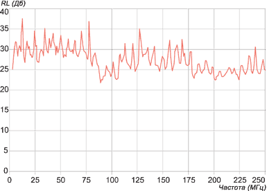 Структурные возвратные потери (SRL) кабеля суммируются с потерями на отражение соединительных устройств, что приводит к увеличению общих возвратных потерь (RL) передающего тракта. График суммарных возвратных потерь представляет собой сильно изрезанную кривую, пример которой изображен на Рисунке 6. Видно, что на нижних частотах кривая не менее изрезана, чем на верхних. Изрезанность на нижних частотах вызвана в основном отражениями от соединителей, в то время как на верхних она обусловлена внутренними отражениями в кабеле. Обратим внимание, что амплитуда осцилляций кривой уменьшается с ростом частоты — это обусловлено увеличением затухания волны в кабеле при распространении. Для кабелей Категории 5е данный эффект проявляется еще в слабой мере, но для кабелей Категории 6 явление насыщения становится заметным в полной мере.