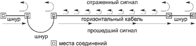 На Рисунке 5 показано стрелками разного размера, что в местах соединений сигнал претерпевает довольно большие отражения, а в длинном горизонтальном кабеле — намного меньшие. Однако интегральный эффект отражений в кабеле зачастую превышает суммарные отражения от соединителей.