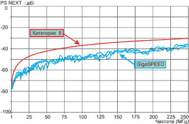 | Рисунок 8. Суммарное переходное затухание на ближнем конце (PS NEXT) для трех трактов (Channels) GigaSPEED компании Avaya. |