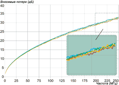 Распространяясь по тракту, сигнал теряет свою энергию. Процесс уменьшения амплитуды сигнала при передаче от начала линии к концу называется затуханием (или ослаблением) и на английском обозначается термином attenuation. На нижних частотах рабочего диапазона (до ~50 МГц) потери сигнала при передаче почти совпадают с собственным затуханием кабельного тракта. При переходе к более высоким частотам (до 100 МГц и выше) потери обуславливаются не только собственным затуханием, но и отражениями в тракте, рассмотренными в предыдущих разделах. Этот процесс меняет плавный («гладкий») ход кривой затухания на слегка извилистый, что хорошо видно на Рисунке 7. Данный факт получил отражение в стандартах: в их новых версиях термин attenuation заменяется на insertion loss, т. е. вносимые потери, где учитывается добавка потерь на отражение. В упрощенной, не совсем верной, трактовке вносимые потери равны сумме затухания и потерь на отражение. Из графиков на Рисунке 7 видно, что из-за отражений в тракте общие потери слегка увеличиваются, по сравнению с регулярной парой, а сама кривая приобретает довольно извилистый характер.