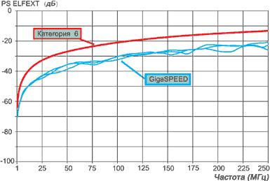 Требования Категории 6 по PS NEXT и PS ELFEXT для тракта показаны в виде графиков на Рисунках 8 и 9. Там же приведены частотные характеристики этих параметров для трактов SYSTIMAX GigaSPEED компании Avaya Communication, состоящих из кабеля 1071, модульного гнезда MGS300, панели переключений PatchmaxGS и соединительных шнуров D8GS. Тракты имеют длину 100 м и содержат четыре соединителя, а по характеристикам значительно превышают требования Категории 6.