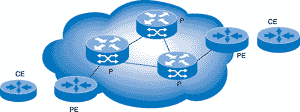 В сети VPN, основанной на технологии MPLS, маршрутизаторы LSR обычно называются поставщиками (Provider, P), а маршрутизаторы LER — пограничными поставщиками (Provider Edge, PE). Распознать поступающий трафик VPN сумеют лишь PE-маршрутизаторы, а P-маршрутизаторы — это обычные LSR. В отличие от сетей второго канального уровня, PE-маршрутизаторам не требуется полносвязная сеть соединений, сколько бы VPN к ним не было присоединено. Маршрутизаторам абонентов (в том числе пограничным) не надо выполнять ничего другого, кроме обычной маршрутизации IP. Множество PE с различными сетями VPN многих абонентов способны совместно использовать магистральную сеть MPLS. Для усиления защиты данных трафик может шифроваться и пересылаться через туннели, хотя это необязательно. Чтобы различать трафик VPN, PE-маршрутизаторы снабжают пакеты дополнительными метками. Однако P-маршрутизатор только считывает и заменяет верхнюю метку стека. PE-маршрутизатор на другом конце сети распознает соответствующий трафик VPN, изымает метку VPN из стека и доставляет пакет в надлежащую сеть VPN. Чтобы гарантировать уникальность маршрутов VPN через магистральную сеть MPLS, каждому из них приписывается отличительный признак маршрута (Route Distinguisher, RD). Для повышения масштабируемости PE обмениваются между собой маршрутами VPN с помощью протокола пограничной маршрутизации (Border Gateway Protocol, BGP) с мультипротокольными расширениями, что позволяет собирать информацию о маршрутах VPN, проходящих через магистральную сеть.