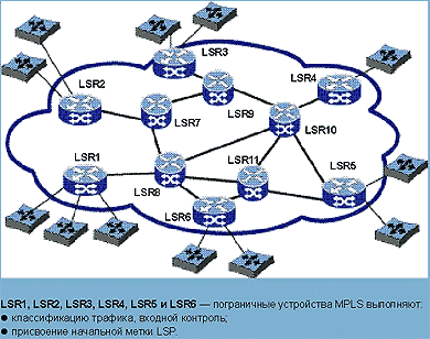 Особую роль в сети выполняют пограничные LSR, т. е. те устройства, часть интерфейсов которых связана с маршрутизаторами, не поддерживающими MPLS (см. Рисунок 4). Они должны в общем случае выполнять классификацию, входной контроль, создание заголовков MPLS и задание для входящего в домен MPLS трафика начального значения метки соответствующего пути, а при выходе трафика из этого домена — удаление заголовка MPLS и отправку пакета по его IP-адресу назначения. Все промежуточные LSR вдоль пути просто продвигают пакет на основе значения поля метки.