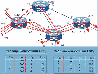 В основе всех вариантов MPLS лежит концепция виртуального канала или пути. Хотя здесь он имеет особое название — путь коммутации меток (Label Switching Path, LSP), — это тот же способ продвижения пакетов/ кадров/ячеек, который используется в сетях X.25, frame relay и ATM. LSP прокладывается в сети MPLS, состоящей из особых устройств, называемых маршрутизаторами коммутации меток (Label Switch Router, LSR), соединенных обычными каналами передачи данных. Путь определяется последовательностью меток, содержащихся в таблицах коммутации LSR (см. Рисунок 3). Метка MPLS — аналог идентификатора виртуального канала frame relay (Data Link Channel Identifier, DLCI) или идентификатора виртуального пути/канала АТМ (VPI/VCI). При поступлении «маркированного» пакета LSR просматривает таблицу коммутации и находит следующий транзитный узел — очередной LSR вдоль виртуального пути, а также новое значение метки.