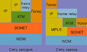 Взаимодействие протоколов Стеки транспортных протоколов. Поскольку операторы в течение последующих полутора лет собираются модернизировать свои магистральные сети, а расширенные услуги передачи голоса становятся доступными по IP, роль технологии ATM снижается, открывая дорогу IP-ориентированной технологии MPLS, а SONET/SDH встраивается в маршрутизаторы, позволяя отказаться от оборудования SONET/SDH. |