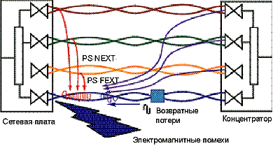 Самый серьезный источник перекрестных помех — ближний (к приемнику) конец кабеля. Именно поэтому в нормативном критерии для систем кабельной проводки Категории 5 первоначально особое внимание уделялось установлению ограничений на величину переходного затухания на ближнем конце (Near End CrossTalk, NEXT). Однако с повышением частоты увеличивается как погонное (уровень сигнала в приемнике снижается), так и переходное затухание (помехи возрастают). В этом случае еще сложнее обеспечить уровень сигнала выше уровня переходного затухания, поэтому необходимо предупредить даже самые незначительные причины возникновения помех.