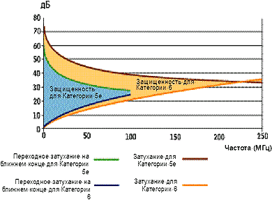 Рабочие характеристики популярной ныне Категории 5 определяются в частотном диапазоне от 1 до 100 МГц. При разработке стандарта на Категорию 6 ставилась задача расширения верхней границы этого диапазона до 250 МГц в целях поддержки в будущем технологий со скоростями, превышающими Gigabit Ethernet (GigE). (Сравнение предложенных ограничений на затухание сигнала и уровень переходных помех для Категории 5e и Категории 6 представлено на Рисунке 1.) Вероятно, скорость GigE — предел для проводки Категории 5 (или 5e). Расширение рабочего диапазона частот кабельной системы обеспечит более высокие скорости передачи данных, а также снизит стоимость GigE.