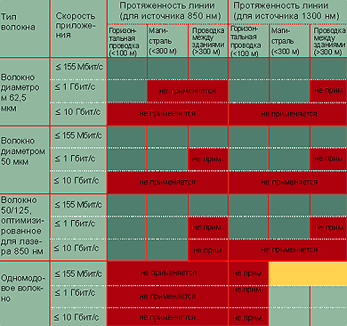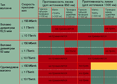 | Таблица 1. Достижимые скорости передачи для разных типов волокон. |