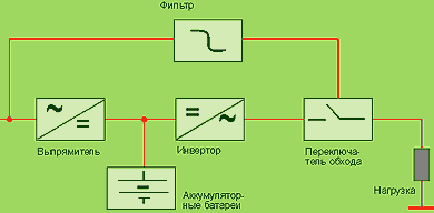 | Рисунок. Функциональная схема ИБП с двойным преобразованием. |