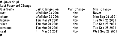 Программа, представленная на Листинге 2 — pwexp2.pl, — печатает данные об изменениях и устаревании паролей для систем, где используется файл /etc/shadow. Ее необходимо запускать с привилегиями root, иначе файл /etc/shadow будет недоступен всем остальным пользователям. Результат выполнения команды pwexp2.pl показан на Рисунке 4.